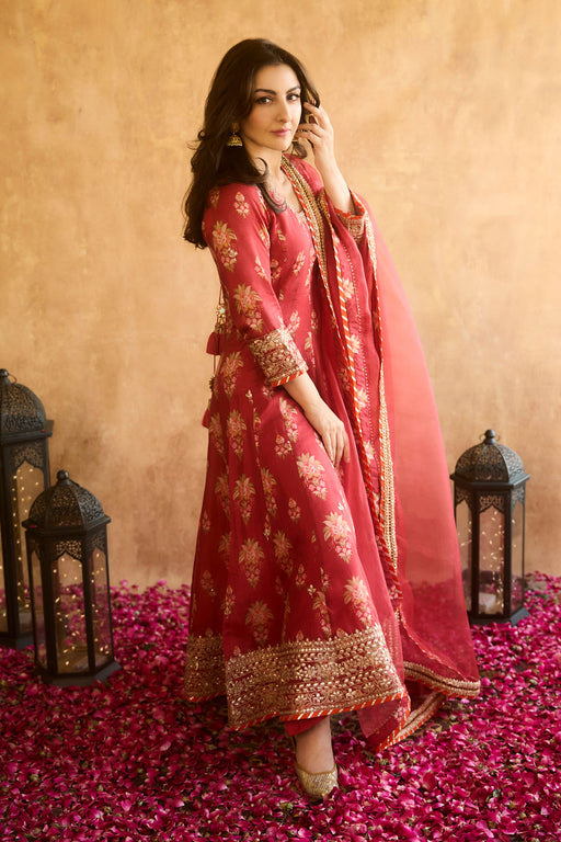 View full detailsThe outfit in the image is a stunning pink ensemble featuring a one-shoulder top adorned with intricate gold embroidery and ...