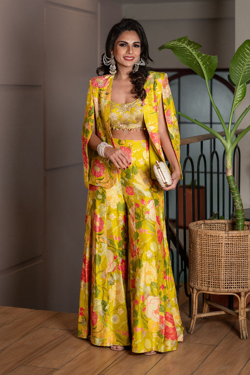 View full detailsThis vibrant outfit features a lively yellow and pink floral print, comprising a chic cape blazer, an intricately embroidere...