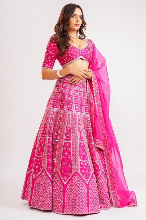View full detailsMirror Work Bridal Lehenga in Pink – Designed in a delicate pink hue, this bridal lehenga is crafted from raw silk and organza, offering a perfect ...