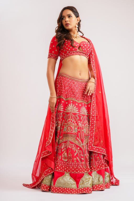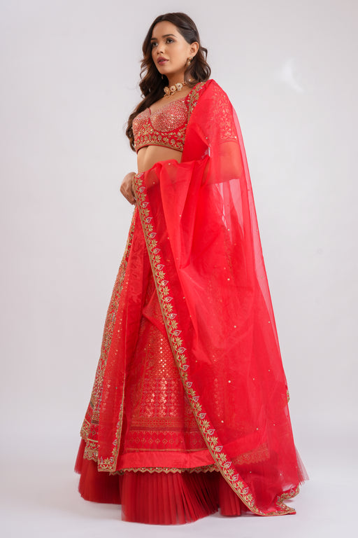 View full detailsBridal Lehenga with Flared Net in Red – Crafted from a luxurious blend of raw silk, organza, and net, this exquisite bridal lehenga features a volu...