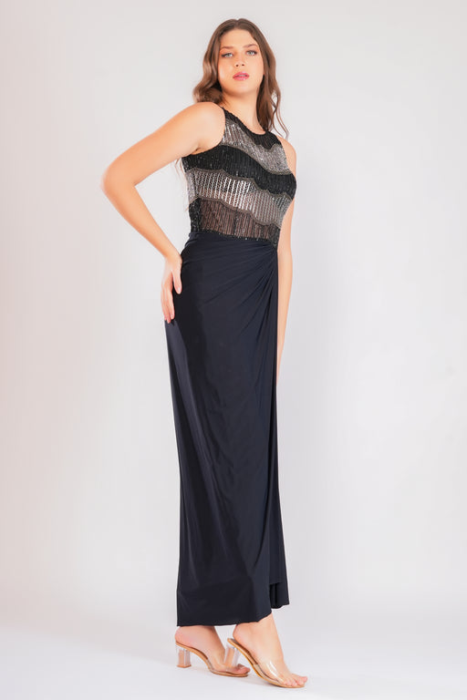 View full detailsBlack Drape Gown – Designed with a blend of bubble lycra and net, this draped gown exudes sophistication and modern elegance. The fluid silhouette ...