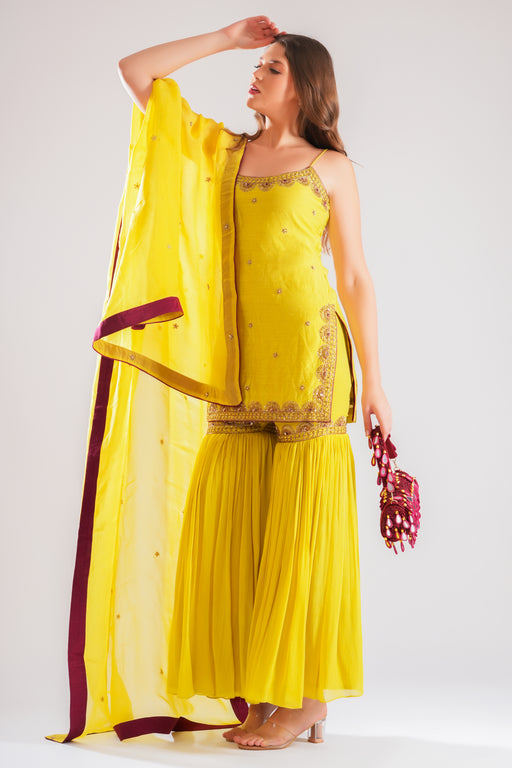 View full detailsYellow Hand-Embroidered Sharara Set – A graceful blend of Georgette, Chanderi Silk, and Viscose Organza, this vibrant ensemble exudes elegance and ...