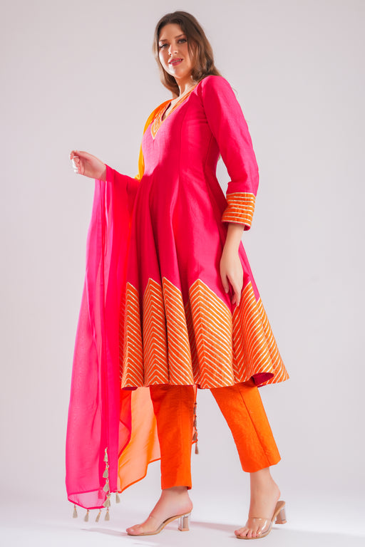 Anarkali with Dual Shade Dupatta and Gotta Work – A regal ensemble crafted from raw silk and viscose organza, featuring intricate gotta work for a ...