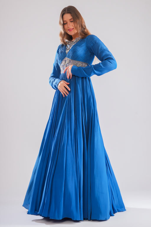 View full detailsFlared Gown with Ruching Hand Embroidery – Designed in a captivating blue hue, this gown is crafted from crepe and net, offering a fluid silhouette...