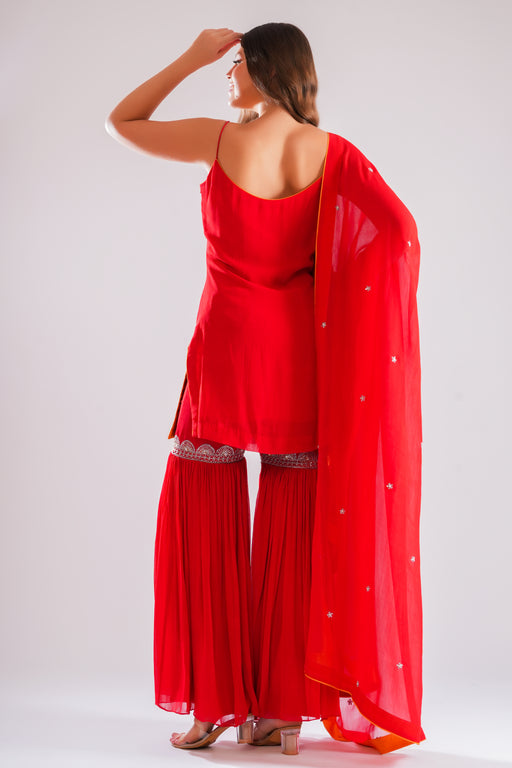 View full detailsHand-Embroidered Sharara Set in Red – A stunning fusion of tradition and elegance, this georgette and viscose organza sharara set is adorned with i...
