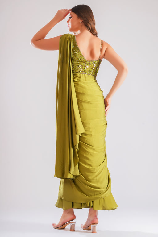 View full detailsGreen Pre-Draped Saree Gown – Crafted from luxurious satin, this elegant ensemble combines the grace of a saree with the ease of a gown. The fluid ...