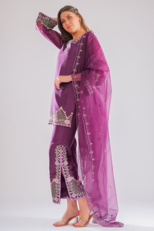 View full detailsPurple Suit Set with Slit Flared Pant – Crafted from Muslin and Organza, this contemporary ensemble features a sleek silhouette with flared pants a...