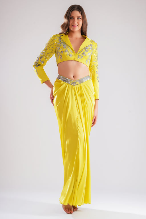 View full detailsJacket with Drape Skirt – Crafted from luxurious satin in a radiant yellow hue, this ensemble exudes elegance and modern sophistication. The struct...