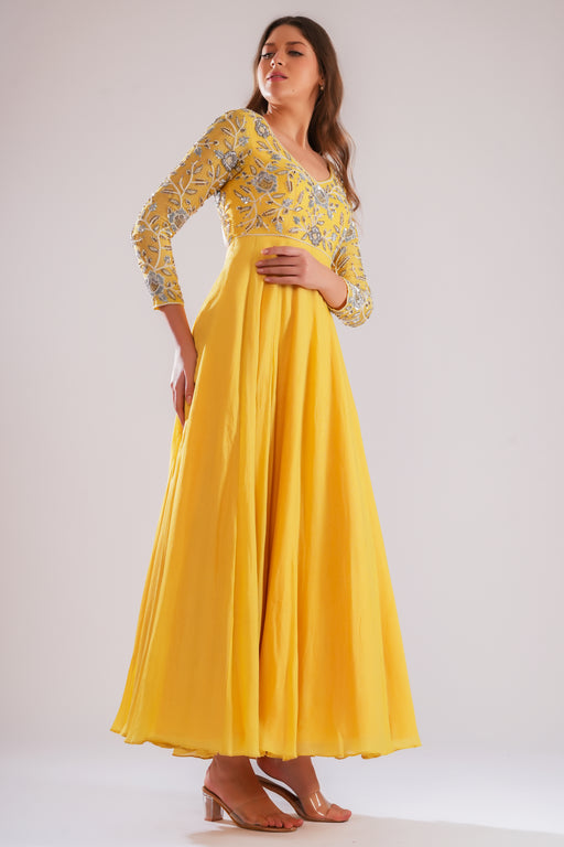 View full detailsBackless Flared Gown – Designed in flowy georgette and a stunning yellow shade, this gown is the epitome of elegance and glamour. The backless desi...
