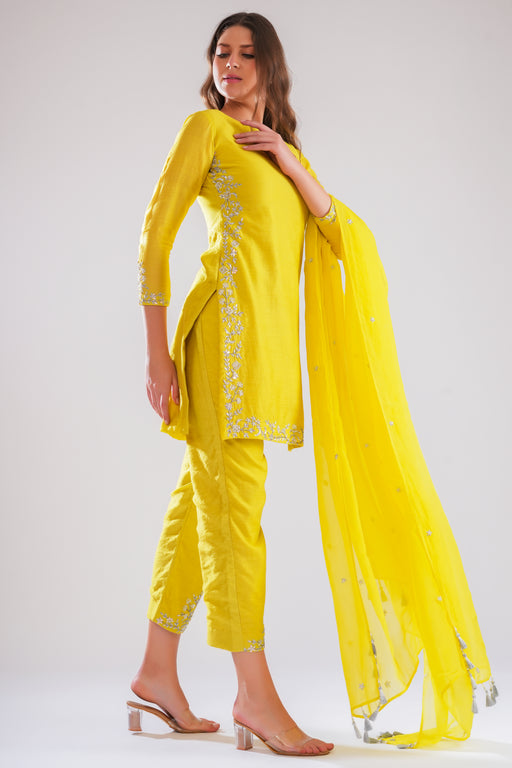 View full detailsSuit Set – Crafted from luxurious Chanderi Silk and Viscose Organza, this elegant yellow suit set radiates sophistication and charm. The lightweigh...