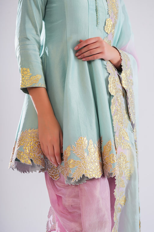 View full detailsShort Anarkali with Dhoti Pant Set in Minty Blue & Pink – Crafted from tissue and viscose organza, this stylish ensemble features a short Anark...