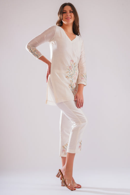 View full detailsOff-White Casual Cord Set with Threadwork – Crafted from Chanderi Silk, this elegant co-ord set combines casual comfort with intricate threadwork d...