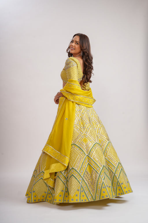 View full detailsYellow Embroidered Lehenga Set – A stunning ensemble crafted from tissue and viscose organza, adorned with intricate embroidery. The vibrant yellow...