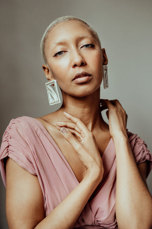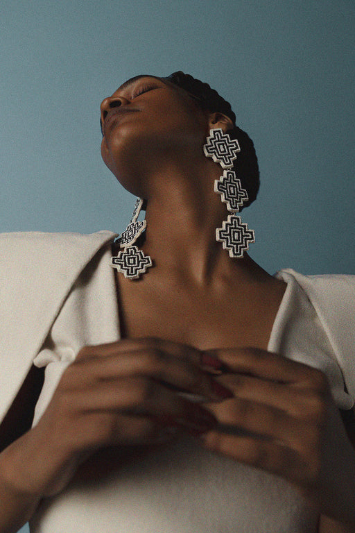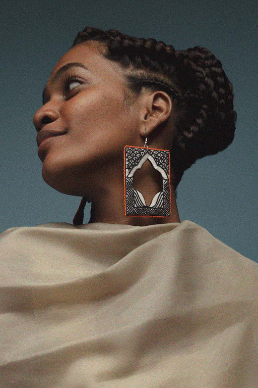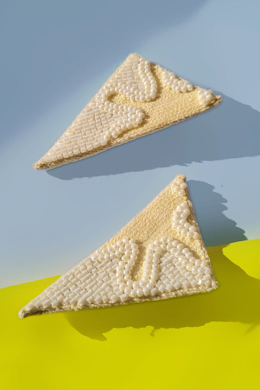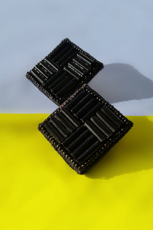 View full detailsStep out of the ordinary with our "Out of the Matrix" stud earrings. These off-white square studs use intricate beadwork and dabka embroidery to cr...