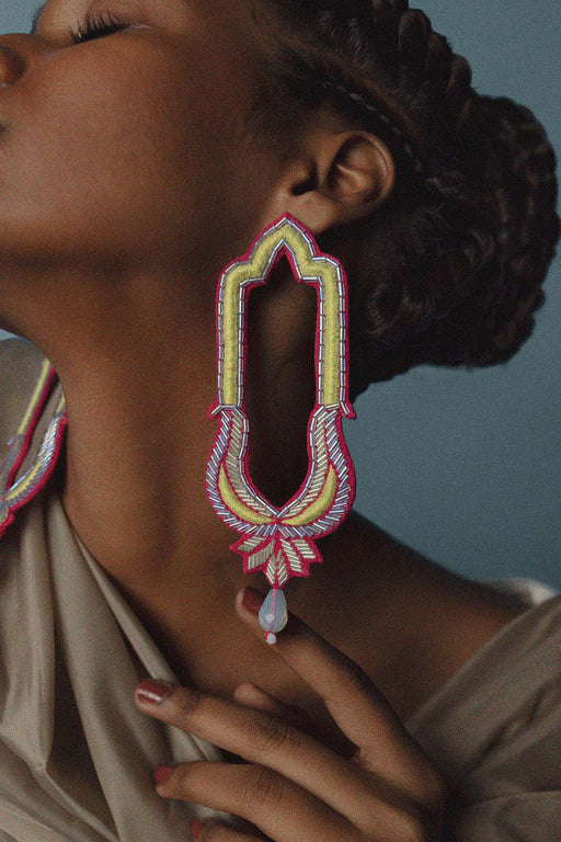 Intricately embroidered earring with a twisted fabric silhouette