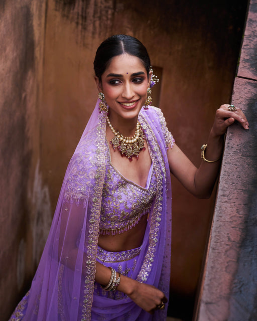 Product Description: This is an Heliotrope Gotapati Georgette lehenga set paired up with Net blouse enhancing the look with Zardozi embroidery. T...
