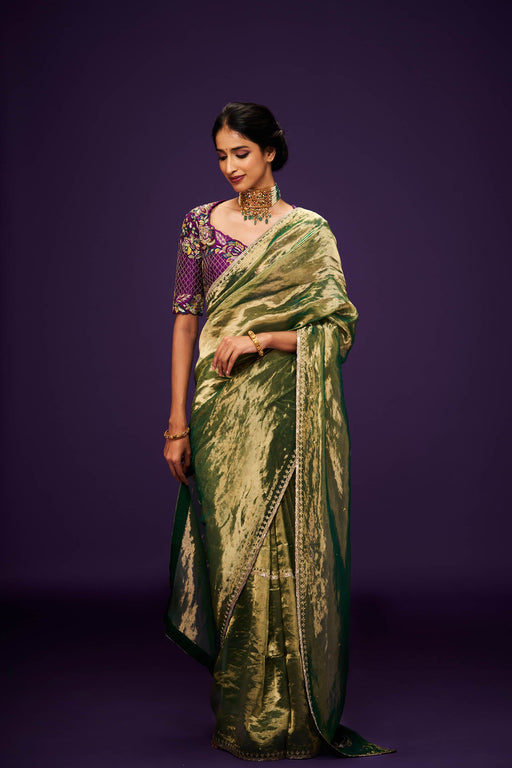Product description:  A green hand embroidered blouse adding a unique touch to the traditional attire. on the other hand, the tissue saree is made...