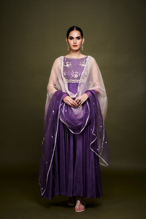 Description: This is a Dusky Purple dress with heavy pearl & zardozi hand embroidered work & dupatta with pearl & sequins work. Saree d...