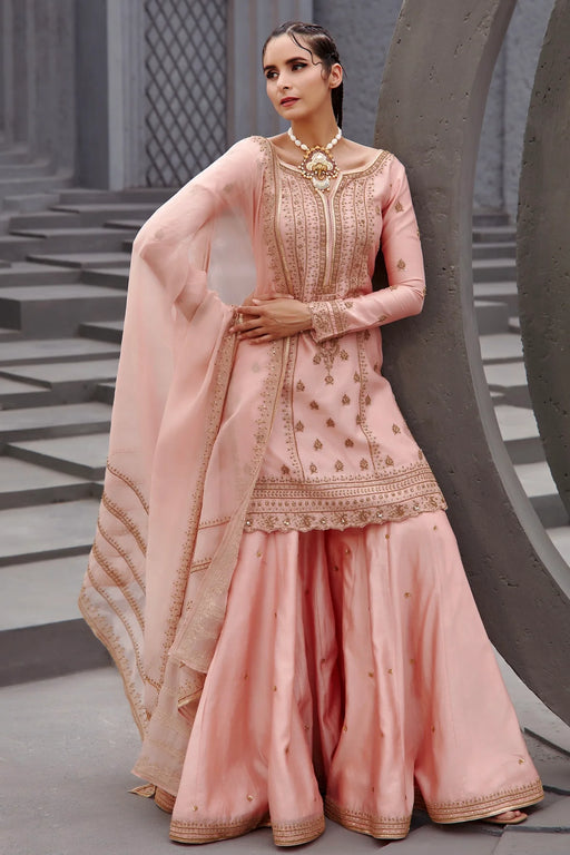 Featuring an aurora pink Chanderi jacket pant set paired with organza base dupatta with light gold dori and aari embroidery on it.