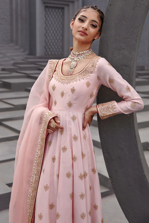 Featuring a pink Chanderi Anarkali paired with cotton silk churidar and organza base dupatta with gold dori and aari embroidery on it.