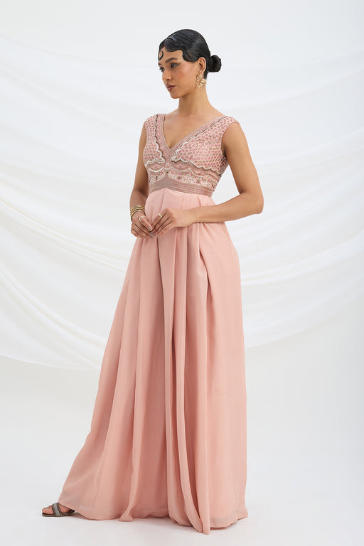 EMBROIDERED JUMPSUIT • Color: PEACH PINK • No. of Components: 1 • Fabric: VISCOSE CREPE • Length: JUMPSUIT-62" • Fit Type: FIT AT BUST • Em...