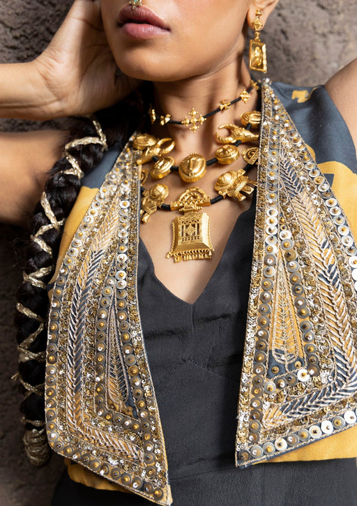 An avant-garde expression is showcased in this placement print jumpsuit featuring a kaftan inspired bodice. It is further enhanced with embroidery ...