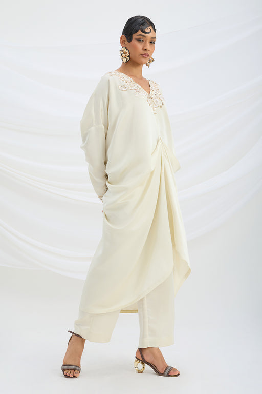 View full detailsBEIGE EMBROIDERED DRAPED KAFTAN WITH BOTTOM • Color: BEIGE • No. of Components: 2 • Fabric: SEMI SATIN • Length: KAFTAN- 54" ...