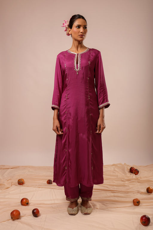 View full detailsPurple Suit Set: A-Line Hand Embroidered Suit Set with Hand Embroidered Pant bottoms paired with Machine and Hand Embroidered Organza Dupatta Fabri...