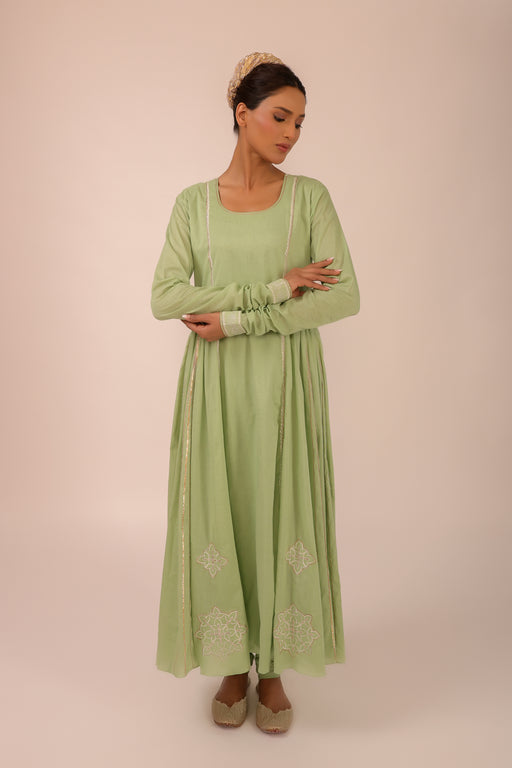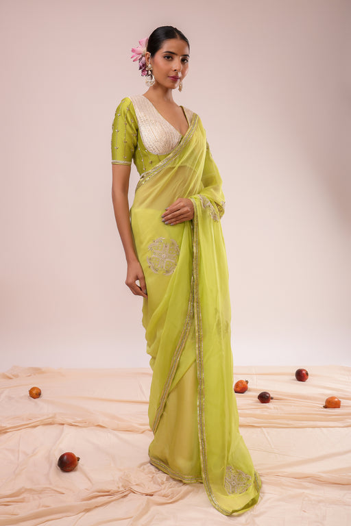 View full detailsLight Green Embroidered Saree Set: Organza Saree with Machine and Hand Embroiderey paired with Hand and Machine Embroidered stitched blouse Fabric ...