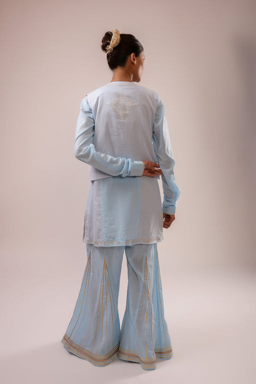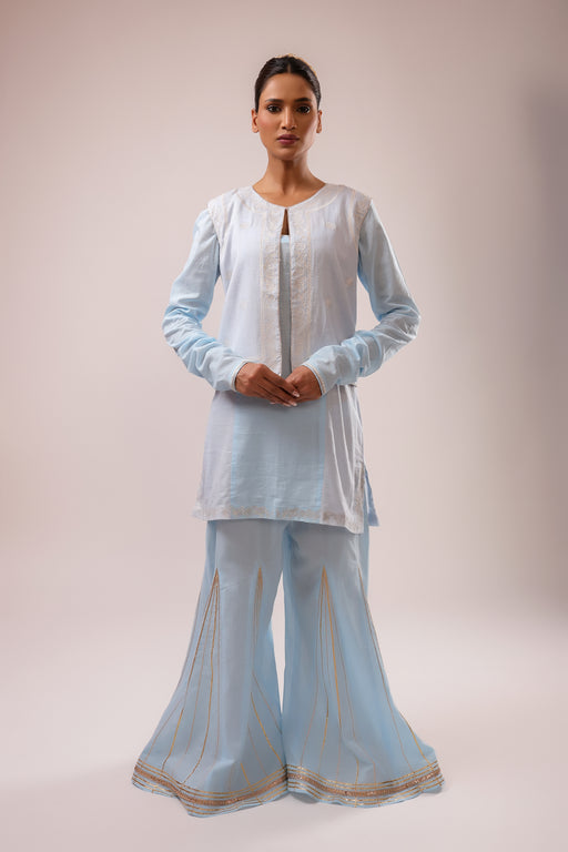 View full detailsSharara Jacket Set: Machine Embroidered Pure Cotton Kurta and Jacket Set paired with Gota Embroidered Sharara Fabric : Suit Set: Pure Cotton Color ...