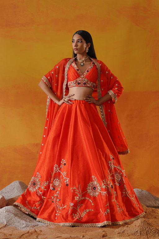 View full detailsKapda Dori's stunning orange dupion silk lehenga, beautifully adorned with intricate sequins, cutdana and stone work . The orange color adds a touc...