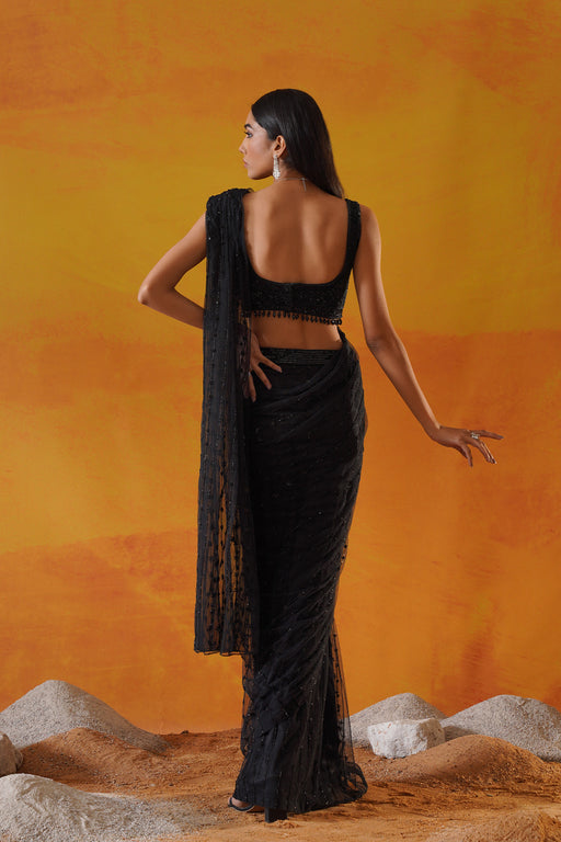 View full detailsKapda Dori's stunning black net ready to wear saree fully embroidered with crystals, beads, cutdana and sequins. The black color adds a touch of gl...