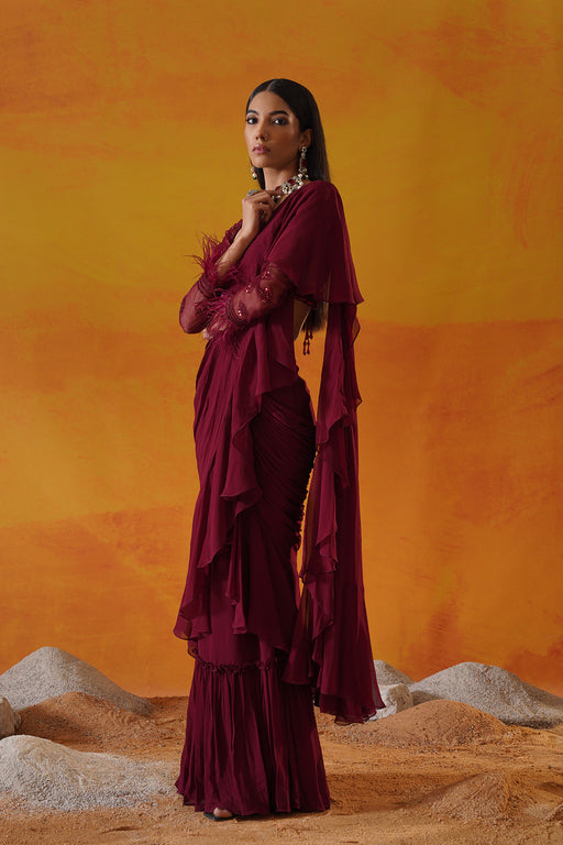 View full detailsKapda Dori's stunning maroon ready to wear ruffle saree. The maroon color adds a touch of glamour and sophistication to your look, while the soft g...