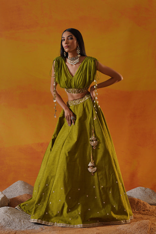 View full detailsKapda Dori's stunning mint green gathered organza lehenga, beautifully adorned with intricate mirror, zari and stones work on belt. The mint green ...