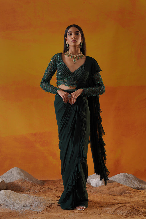 View full detailsKapda Dori's stunning forest green ready to wear ruffle saree. The forest green color adds a touch of glamour and sophistication to your look, whil...