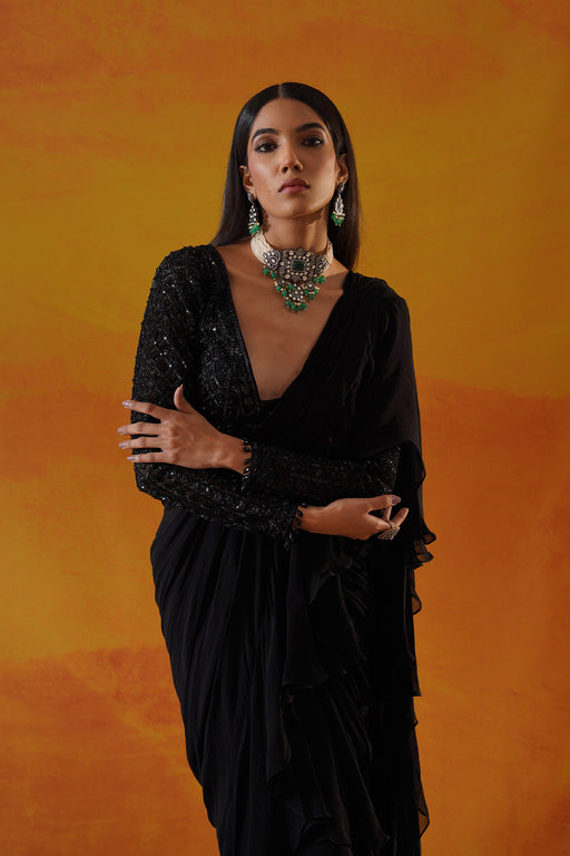 View full detailsKapda Dori's stunning black ready to wear ruffle saree. The black color adds a touch of glamour and sophistication to your look, while the soft geo...