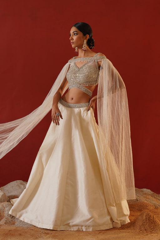 View full detailsKapda Dori's stunning ivory dupion silk lehenga, beautifully adorned with intricate stones and cutdana work . The ivory color adds a touch of glamo...