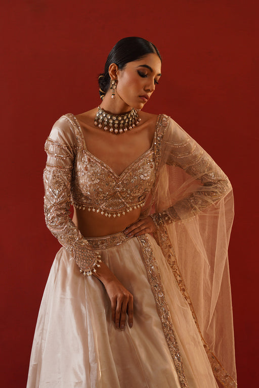View full detailsKapda Dori's stunning nude lehenga set, beautifully adorned with intricate pearls, cutdana, stones and sequins work. The skirt features a full-len...