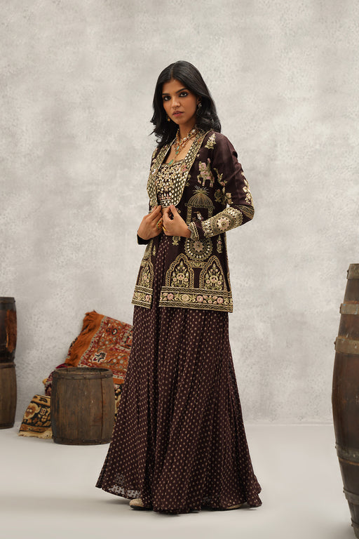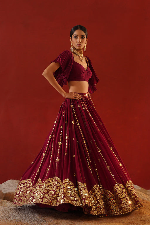 View full detailsKapda Dori's stunning purple geogratte gathered lehenga, beautifully adorned with intricate sequins, pearls, cutdana and stones work on belt. The p...