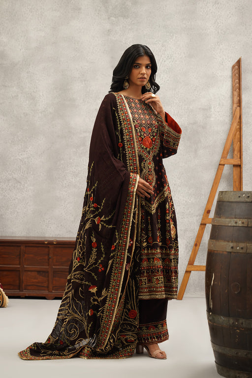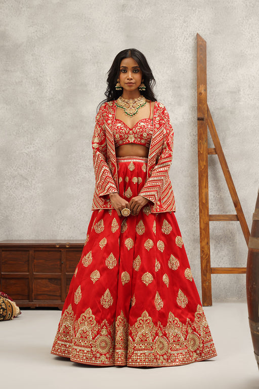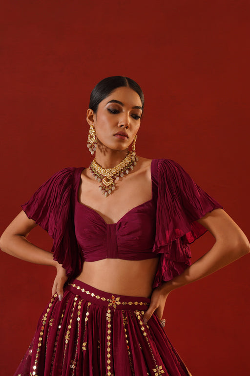 View full detailsKapda Dori's stunning burgundy geogratte layered lehenga, beautifully adorned with all over intricate patra and zari work. The burgundy color adds ...