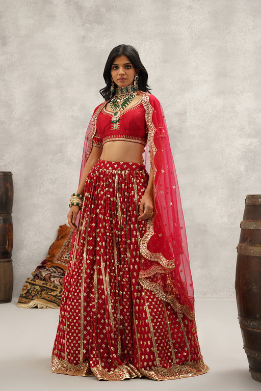 View full detailsKapda Dori's stunning maroon tafta silk lehenga, beautifully adorned with intricate brocade border with zari lace. The maroon color adds a touch of...