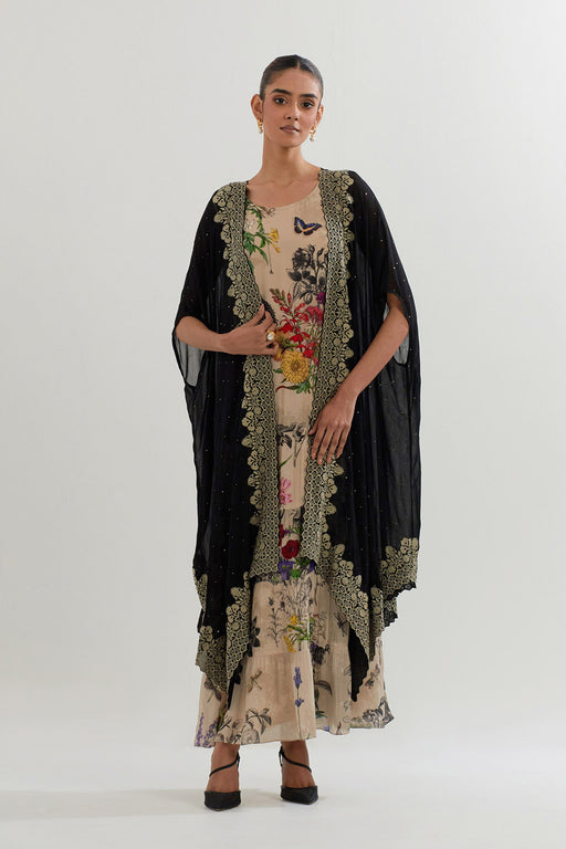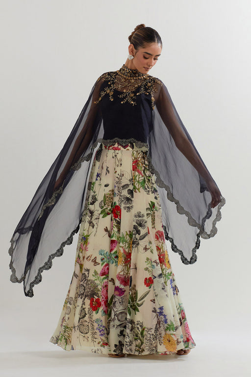 BOTANICAL PRINTED CAPE PAIRED WITH STRETCH INNER AND PRINTED SKIRT Colour: MULTI COLOUR Fabric: VISCOSE GEORGETTE Care: DRY CLEAN ONLY