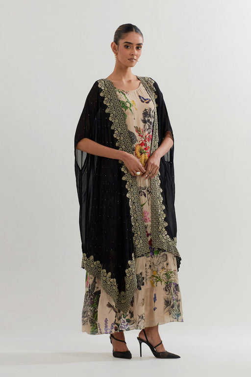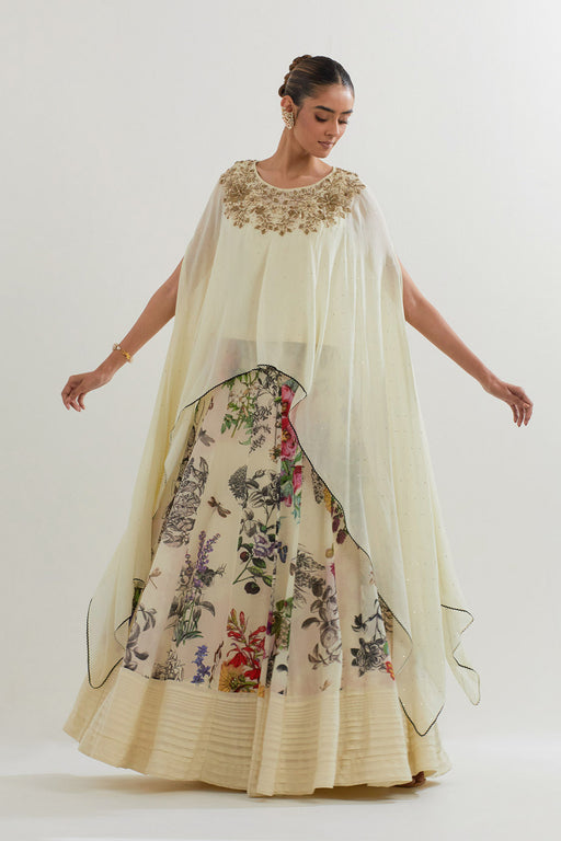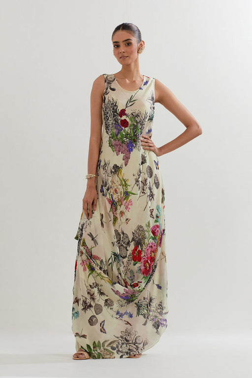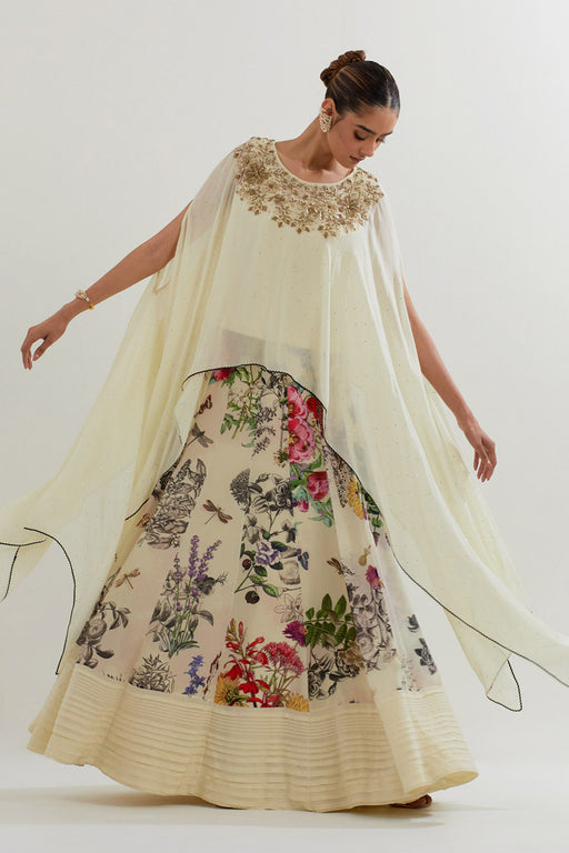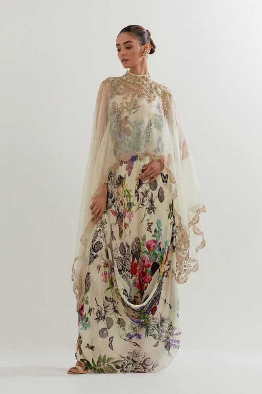 BOTANICA PRINTED COWL DRESS PAIRED WITH ORGANZA HAND EMBELLISHED CAPE Colour: MULTI COLOUR Fabric: ORGANZA /CREPE Care: DRY CLEAN ONLY