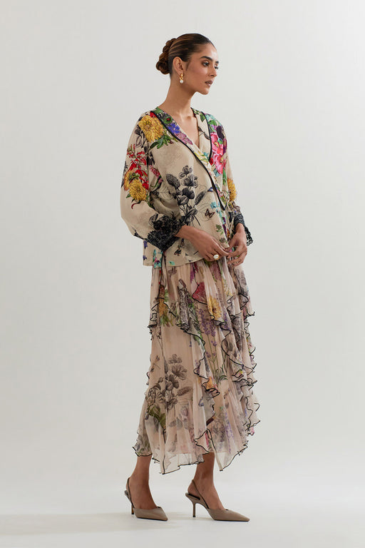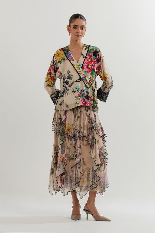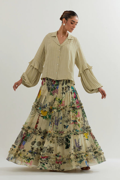 BOTANICAL PRINTED TIERED SKIRT PAIRED WITH HEAVY GEORGETTE PINTUCKED ANS RUFFLED SHIRT Colour: MULTI COLOUR Fabric: GEORGETTE Care: DRY CLEAN ONLY