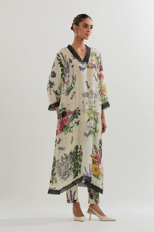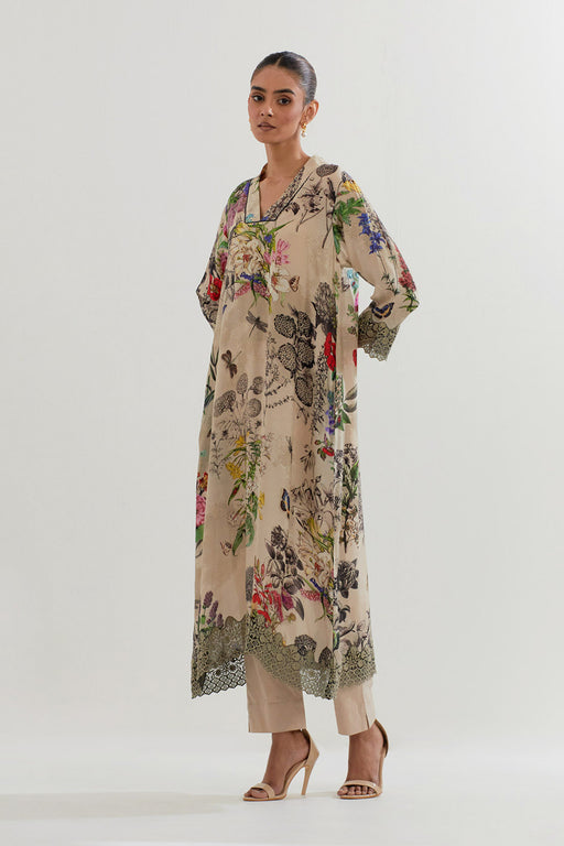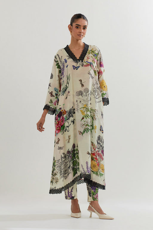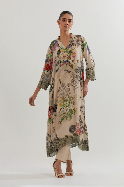 View full detailsBOTANICAL SILK KURTA WITH RESHAM EMBROIDERED DETAILS PAIRED WITH PRINTED PANTS Colour: MULTI COLOUR Fabric: MODAL SILK/ COTTON LYCRA Care: DRY CLEA...