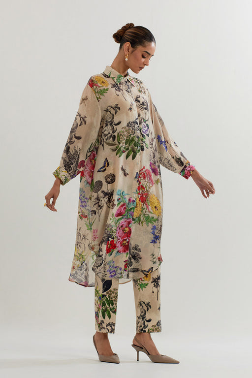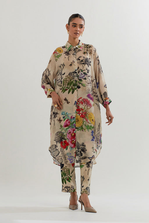 LONG SHIRT TUNIC IN BOTANICAL PRINT WITH REHSAM EMBRODROIDERED BORDER PAIRED WITH STRETCH COTTON PANTS Colour: MULTI COLOUR Fabric: MODAL SILK/ COT...
