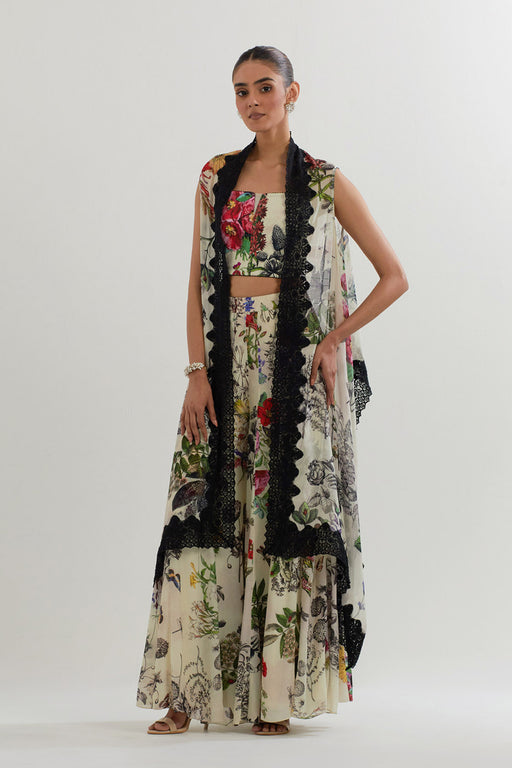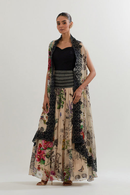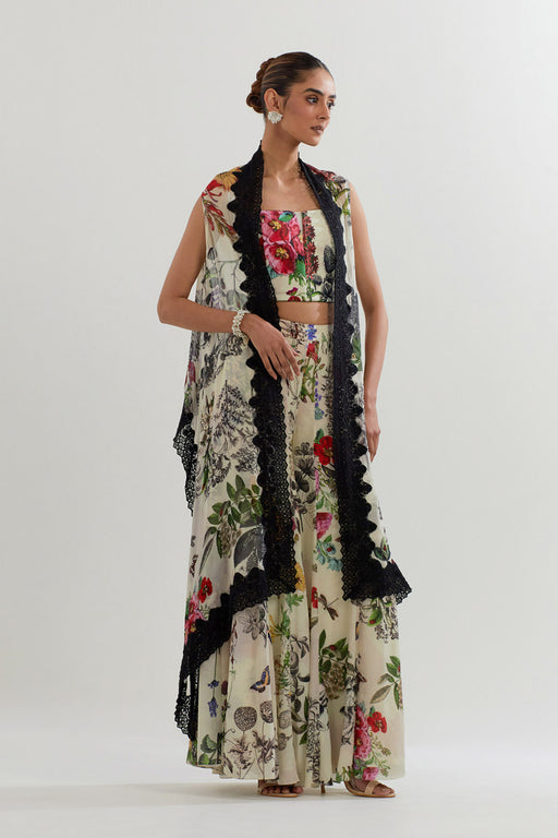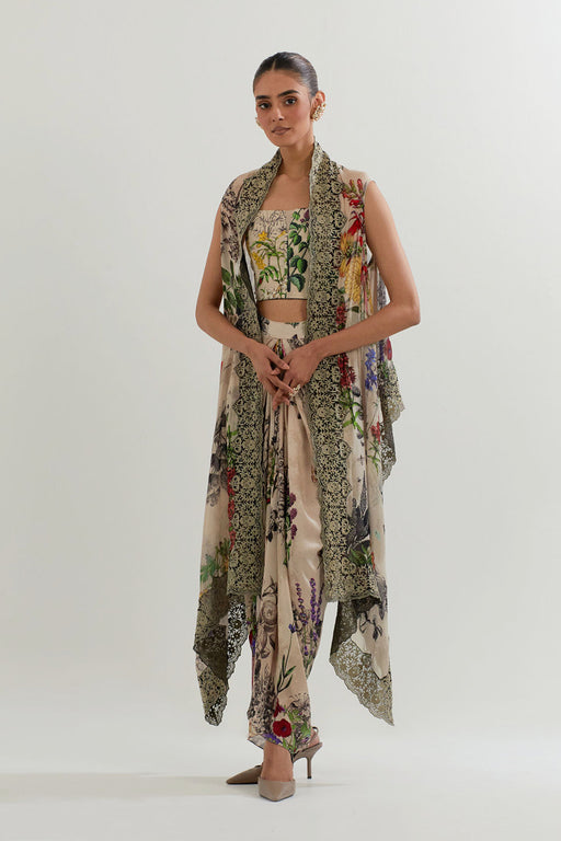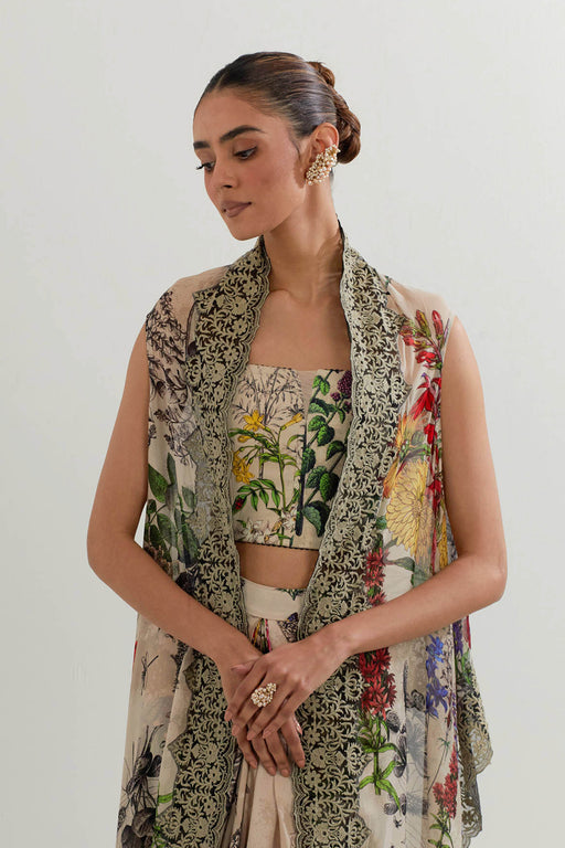 View full detailsBOTANICAL PRINTED PANELLED PANTS PAIRED WITH STRETCH BUSTIER AND CAPE Colour: MULTI COLOUR Fabric: GEORGETTE/ MESH Care: DRY CLEAN ONLY
