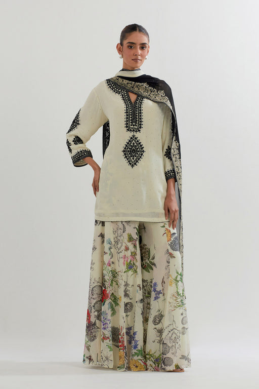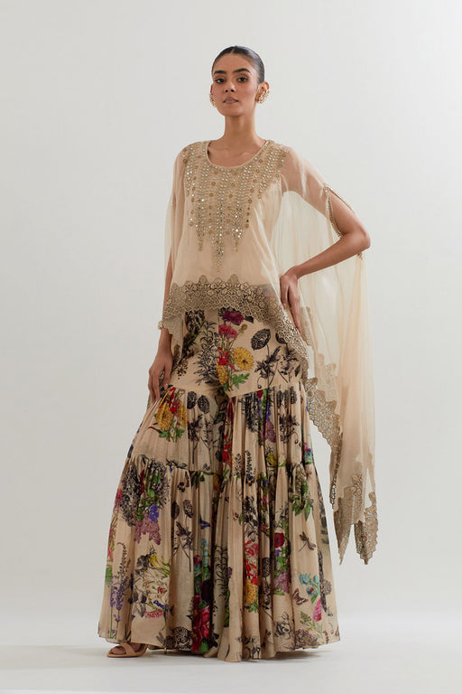 View full detailsORGANZA DUPATTA CAPE WITH HAND EMBELLISHED NECKLINE PAIRED WITH BOTANICAL PRINTED PLEATED SHARARA Colour: MULTI COLOUR Fabric: ORGANZA / CHANDERI C...