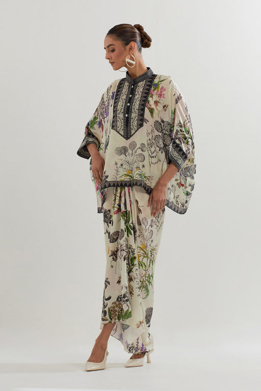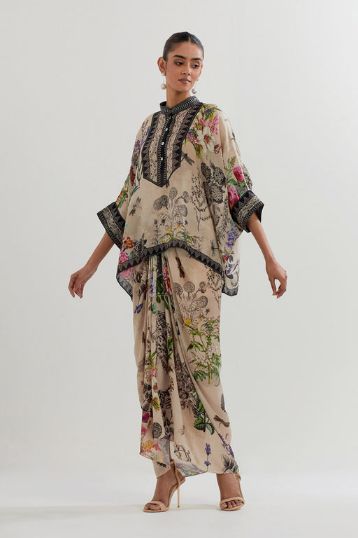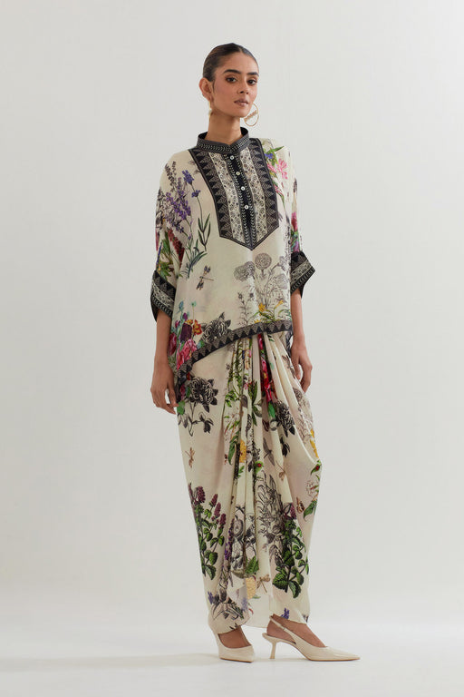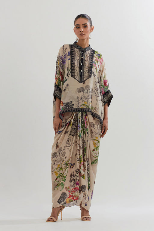 BOTANICAL PRINTED KAFTAN TOP PAIRED WITH DRAPE SKIRT Colour: MULTI COLOUR Fabric: MODAL SILK/ MODAL SATIN Care: DRY CLEAN ONLY