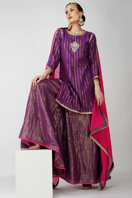 View full detailsStep into elegance with our Purple cotton Silk Garara Suit, crafted for those who cherish both tradition and comfort. The set includes a banarsi ja...